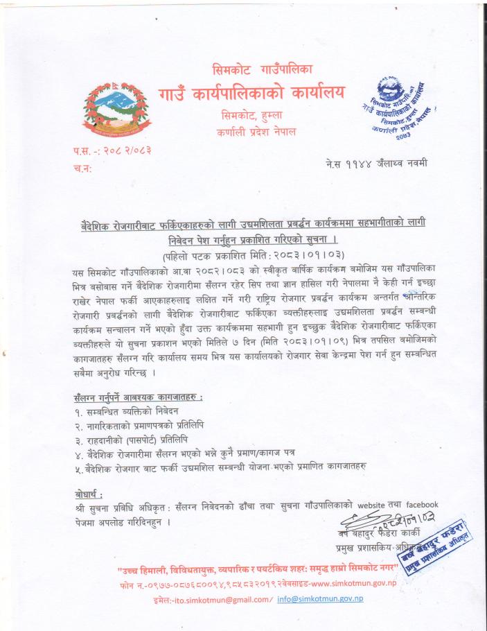 बैदेशिक रोजगारीबाट फर्किएकहरुको लागि उद्यमशिलता प्रबन्ध कार्यक्रममा सहभागिताको लागी निवेदन पेश गर्नुहुन प्रकाशित गरिएको सूचना l