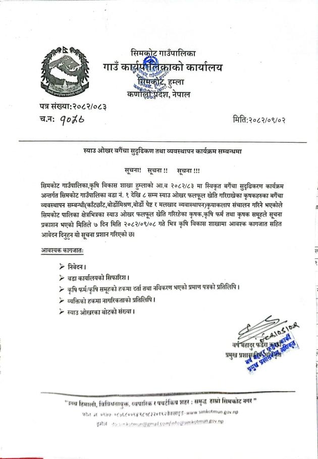 स्याउओखर बगैचा सुधिर्करण तथा व्यवस्थापन कार्यक्रम सम्बन्धि सूचना ...!!!