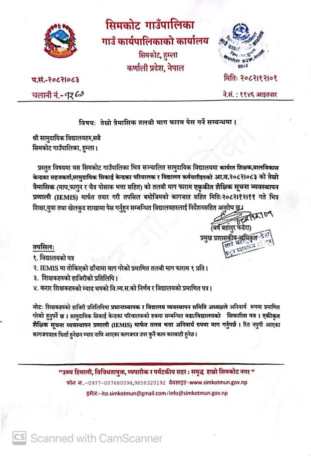 तेस्रो त्रैमासिक तलबी माग फारम पेस गर्ने सम्बन्धि सूचना